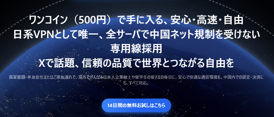 特に公共のフリーWi-Fiを利用することが多いユーザーであれば、中国の訪問以外でも国内でのインターネットセキュリティ向上の施策としての導入もおすすめです。