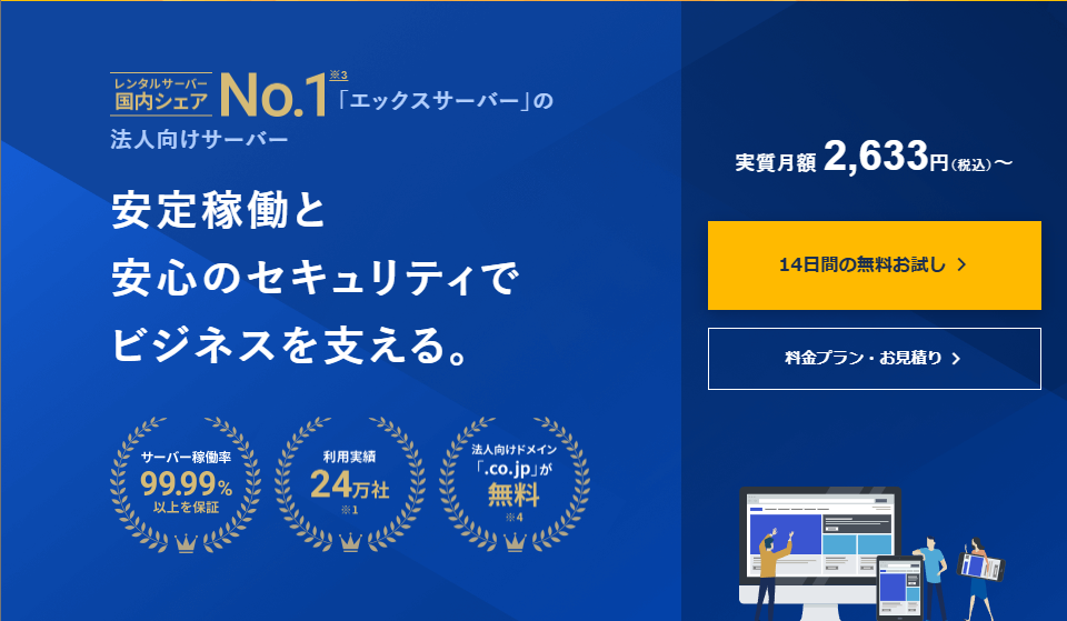エックスサーバービジネスなら.co.jpドメインを永久無料で取得できるのでおすすめです。