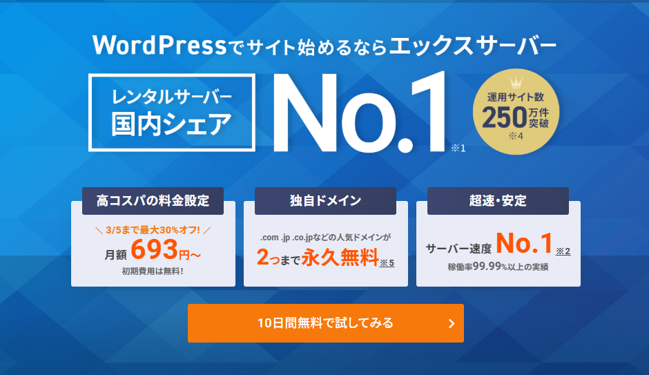 エックスサーバーは19年間のサーバー運用実績、230万以上のサイト運営実績、さらに創業以来99,99%以上の稼働率を維持している安定感・実績のあるレンタルサーバーです。