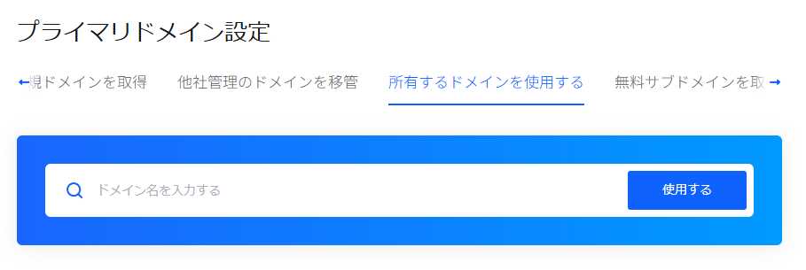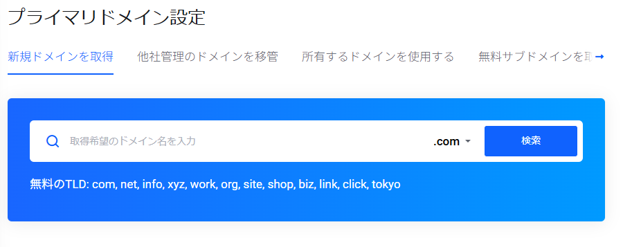 最後にドメインを決めていくので、新しくドメインを取得する際は、入力フォームに希望の文字列を入力してください。その後「検索」をクリックすると、希望のドメインが使用できるか検索してもらえるので、利用できるドメインを選択してください。