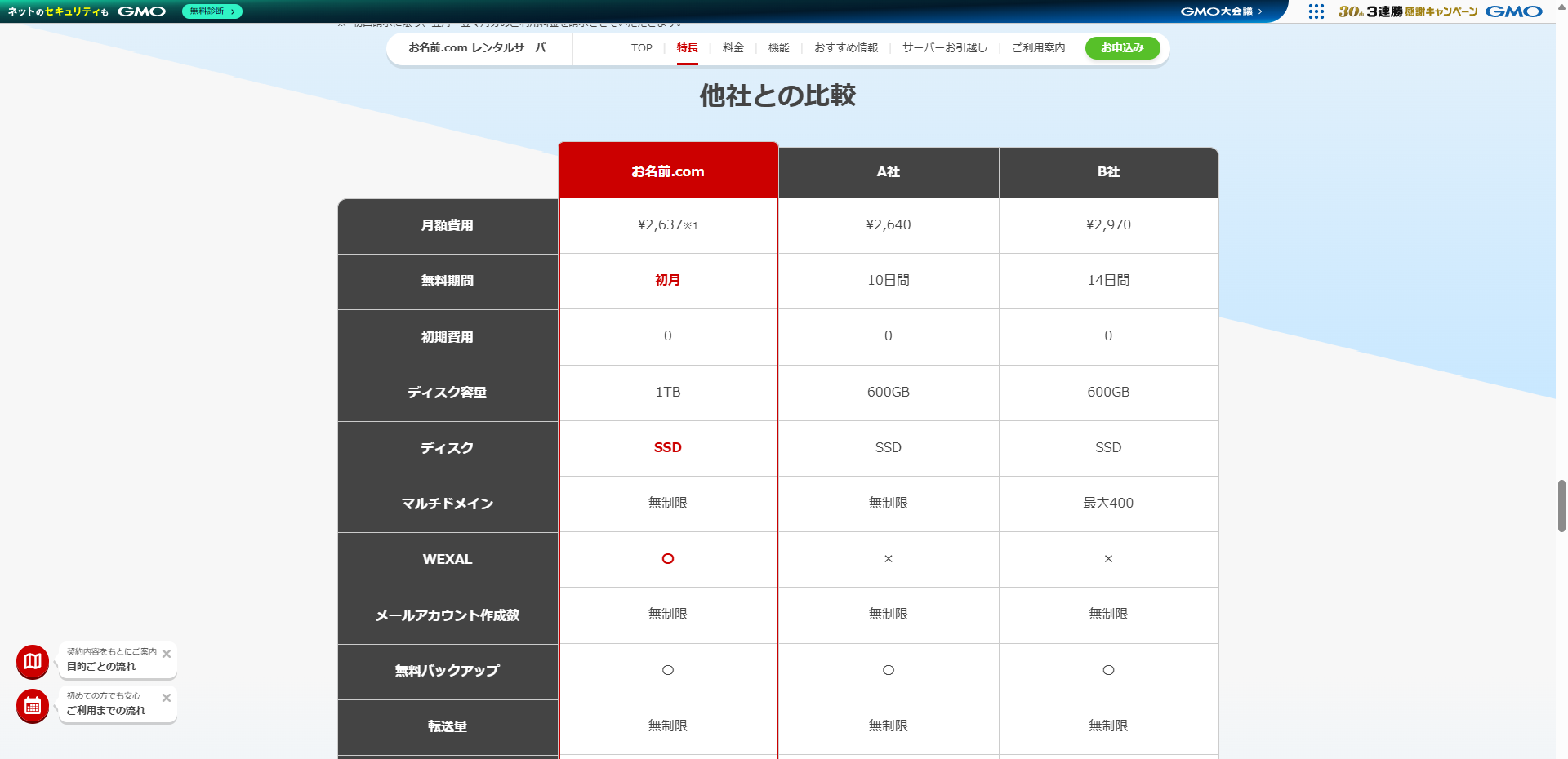 お名前.comと、有名なレンタルサーバー3社と比較した表を作成しましので、下記をご覧ください。